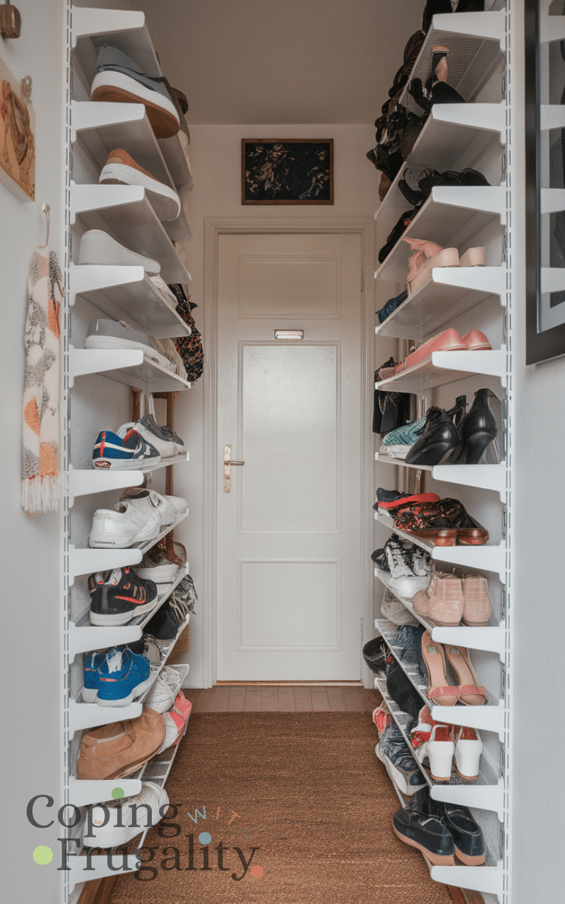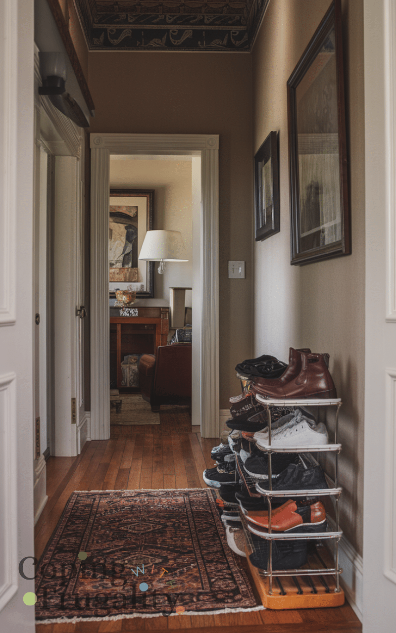 Using slim shoe racks is one of the smartest Hallway Storage Ideas on a Budget because they help you keep shoes organized while saving precious floor space and these narrow racks fit perfectly in tight hallways and create a neat and tidy look and you can place them near the door so everyone can remove shoes comfortably and this idea keeps the area clean and eliminates clutter and choosing a rack with several layers gives you more storage without taking much room and it also helps the hallway feel more open and welcoming.