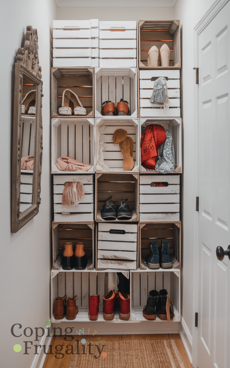 Stackable crates are flexible Hallway Storage Ideas on a Budget because you can arrange them vertically or horizontally to create a custom storage system and you can place shoes or scarves or seasonal items inside and they keep the hallway tidy and nicely structured and this idea looks rustic and stylish while staying inexpensive and you can repaint the crates if you want a more decorative finish.