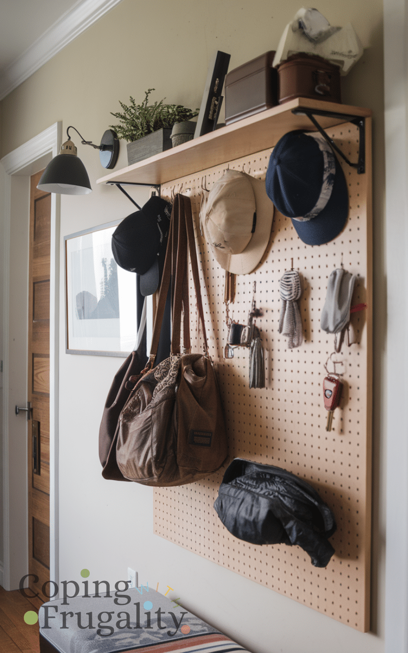 Pegboards are excellent Hallway Storage Ideas on a Budget because they let you customize storage based on your needs and you can hang bags or hats or keys using small hooks and the layout can change anytime which makes it very practical for families and this idea saves space while keeping daily essentials visible and easy to grab and the pegboard also adds a creative touch to the hallway decor.