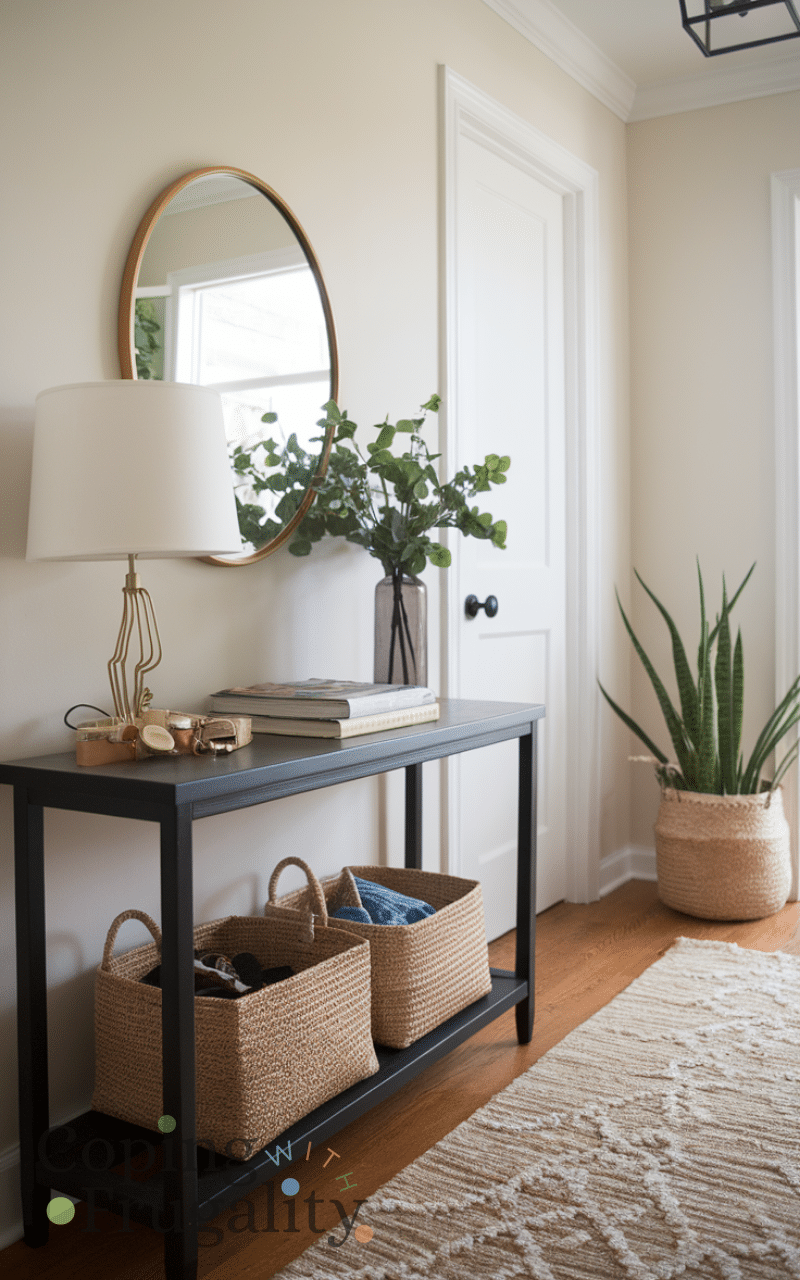 A slim console table is one of the most stylish Hallway Storage Ideas on a Budget because it gives you a small surface to place keys and bags and mail while keeping the hallway open and easy to walk through and you can use the space underneath for baskets or decorative boxes to add even more storage and this idea blends beauty and function in a simple affordable way.