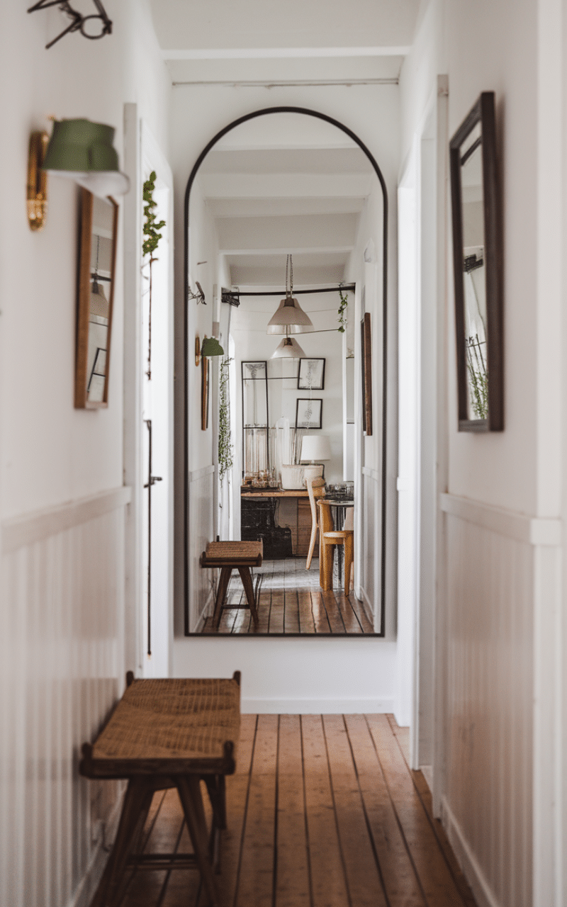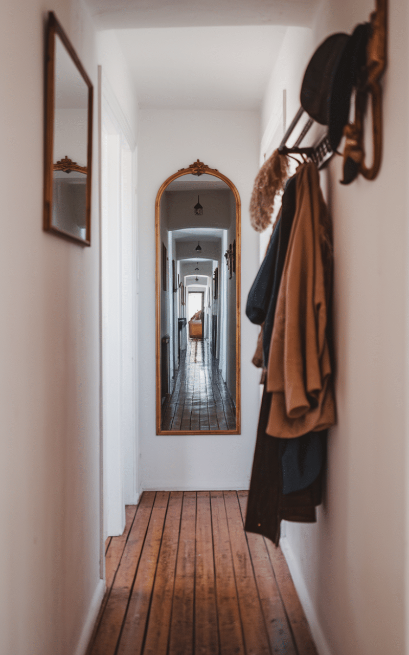 Mirrors are powerful tools for narrow hallway decor on a budget because they reflect light and visually double the space. A large mirror placed along one wall or at the end of the hallway instantly makes it feel brighter and wider. You don’t need an expensive frame—simple mirrors or thrifted finds work perfectly. This idea is especially helpful in hallways with little or no natural light.