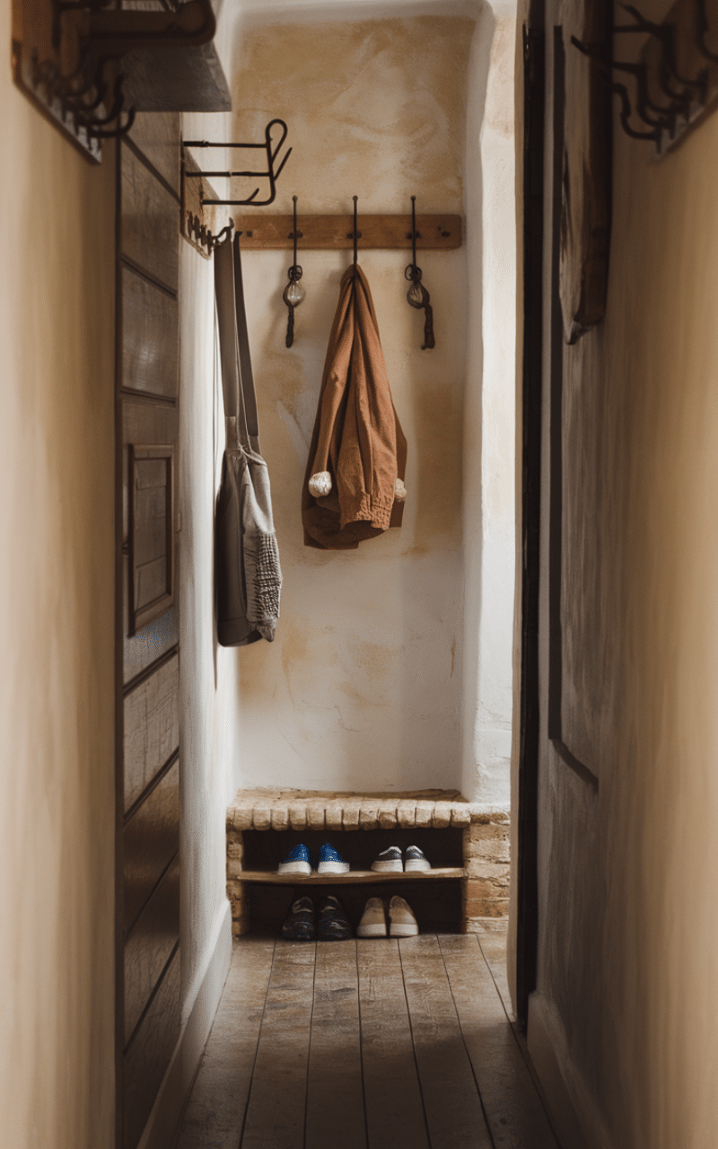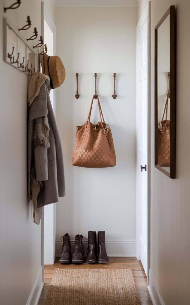 Instead of bulky furniture, slim wall hooks are ideal for narrow hallway decor on a budget. They keep coats, bags, and hats organized while staying close to the wall. Choose hooks in matching finishes to keep the look clean and intentional. This solution saves floor space, reduces clutter, and adds function without overwhelming a narrow area.