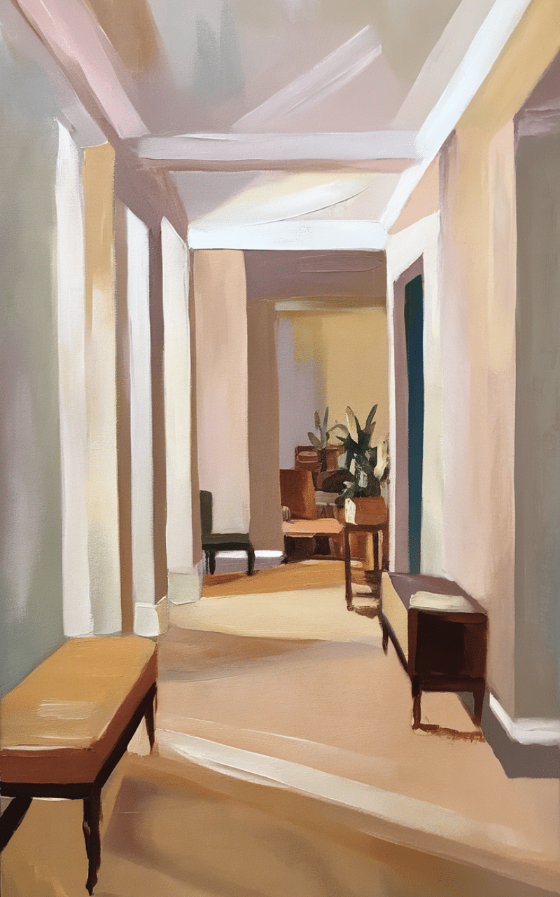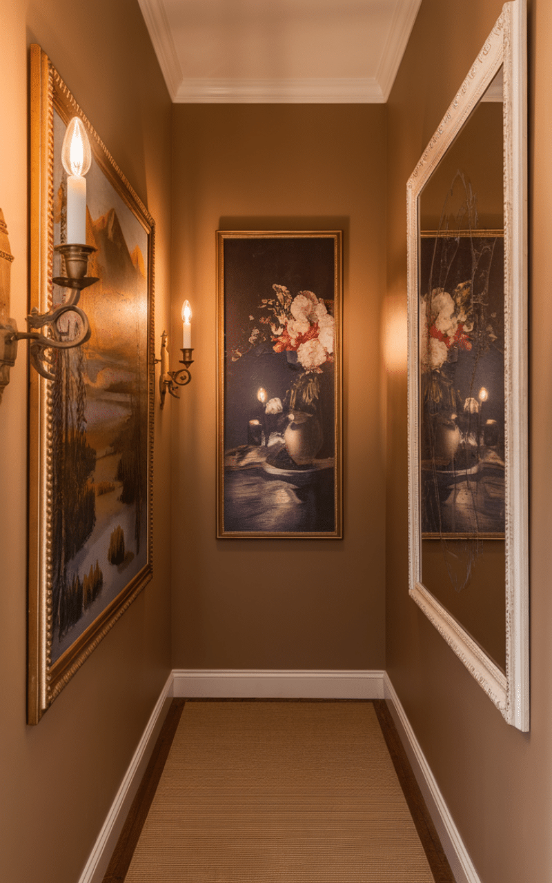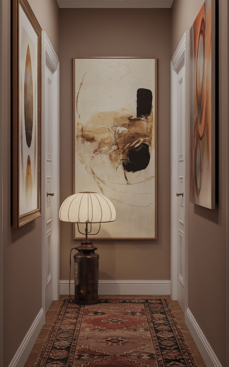 Choosing a few well-placed art pieces is a refined narrow hallway decor on a budget approach. Oversized art or a single statement print can be more effective than many small pieces. Keeping decor minimal prevents the hallway from feeling crowded while still adding character and visual interest.