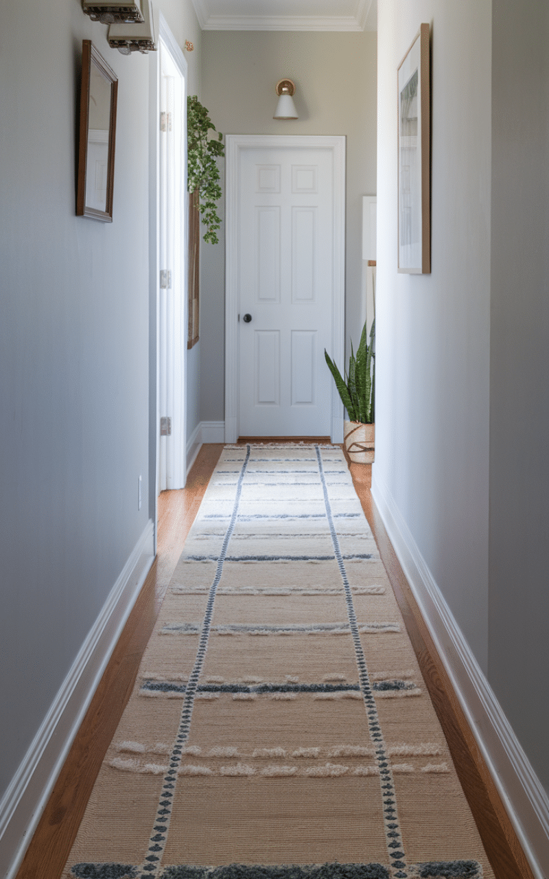 A long runner rug is one of the easiest narrow hallway decor on a budget solutions because it adds warmth, color, and direction without taking up space. Choose a flat-weave or low-pile rug so doors can open easily and the hallway stays functional. Stripes or subtle patterns visually elongate the corridor, making it feel wider. Budget-friendly runner rugs are widely available online and in home stores, and even a simple neutral rug can instantly upgrade the look while protecting your floors at the same time.