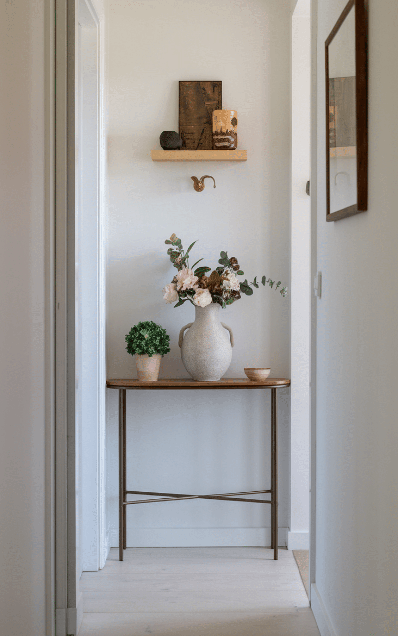 If space allows, a very slim console table or wall-mounted ledge can be a practical narrow hallway decor on a budget solution. It offers a place for keys, mail, or decor while staying unobtrusive. Choose furniture with clean lines and light finishes to keep the hallway open and functional.