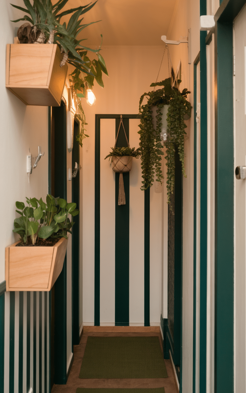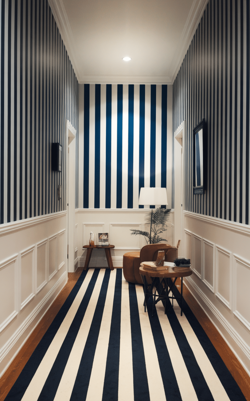 Vertical stripes, whether painted or added with wallpaper, are smart narrow hallway decor on a budget ideas because they visually raise the ceiling and elongate the space. Peel-and-stick wallpaper is affordable, renter-friendly, and easy to apply. This trick draws the eye upward and makes the hallway feel taller and more balanced.