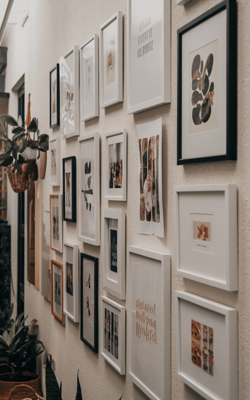 A gallery wall is a creative narrow hallway decor on a budget idea that adds personality without taking up space. Use lightweight frames, printable art, family photos, or even postcards. Keep frames aligned and evenly spaced for a tidy look. Sticking to a limited color palette helps avoid visual clutter and keeps the hallway feeling calm and stylish.