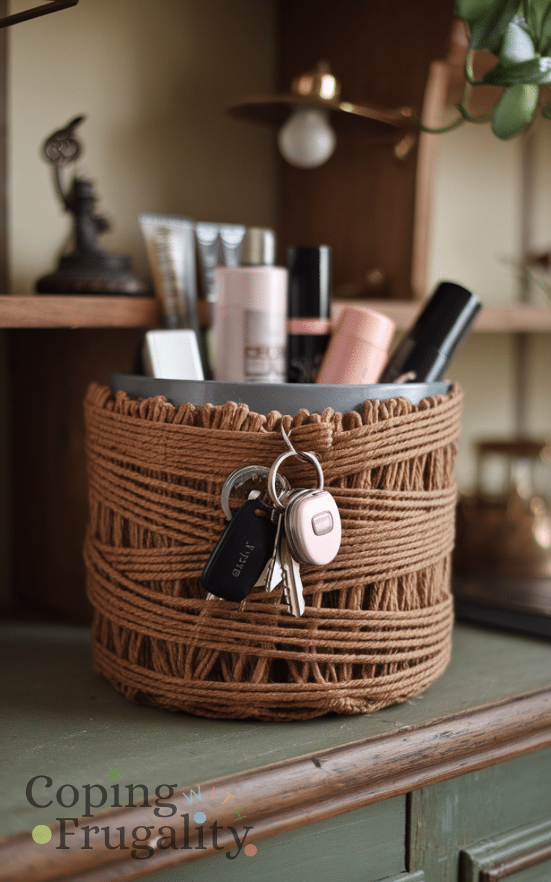 Rustic twine baskets are a creative finish for your vintage crafts on a budget and you can wrap twine around a bowl or container using glue and shape it into a natural looking basket and you can use it for keys makeup or craft supplies and it gives your space a soft rustic charm and this idea uses inexpensive materials and adds a handmade touch to your vintage crafts on a budget.
