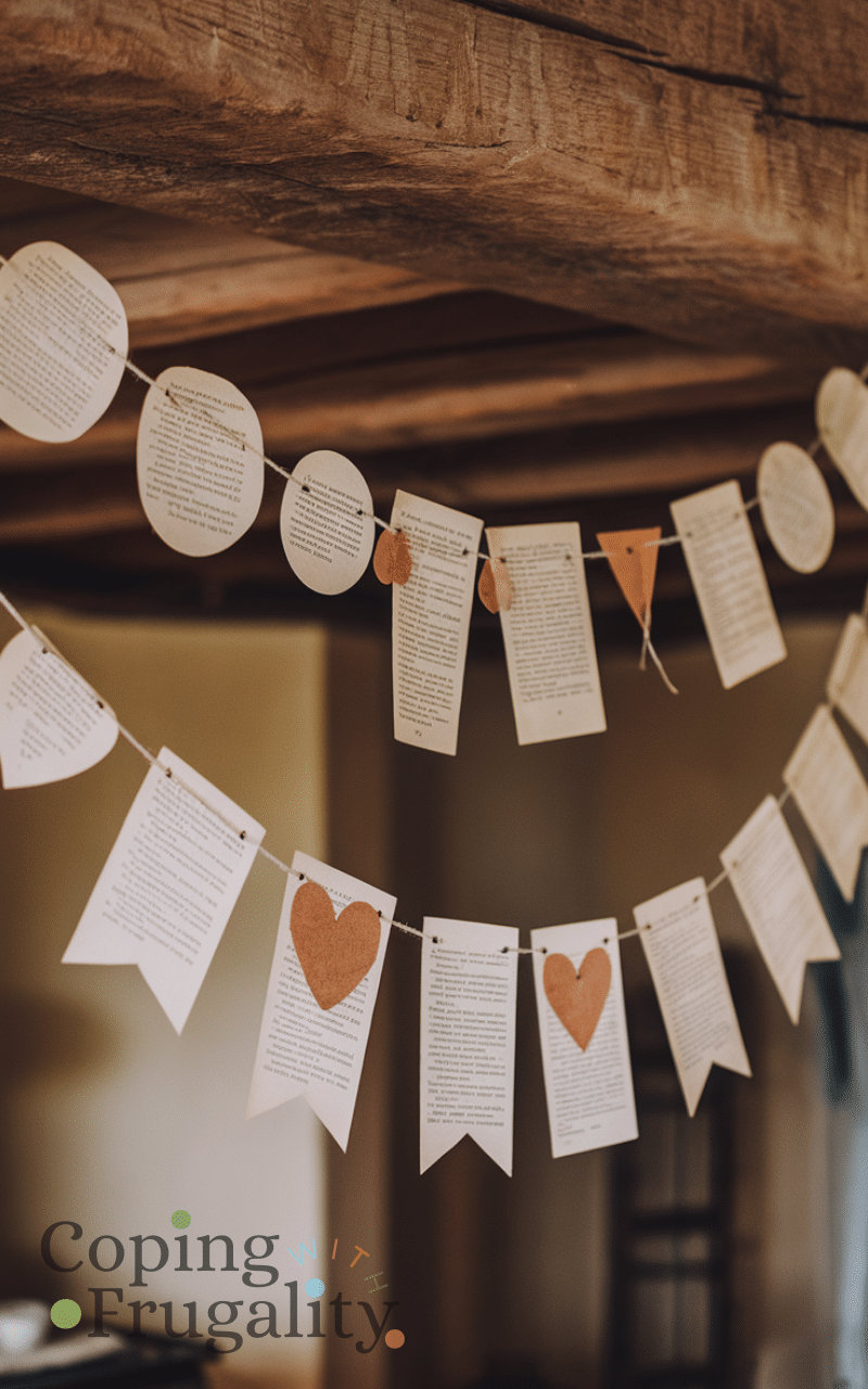 Old book page garlands bring a nostalgic feeling to your vintage crafts on a budget and you can cut pages into simple shapes like circles hearts or flags and attach them to string or twine and this creates a soft decorative garland you can hang across walls windows or shelves and the aged paper gives a warm antique charm and this idea is affordable and effortless and it highlights the sweetness of your vintage crafts on a budget.