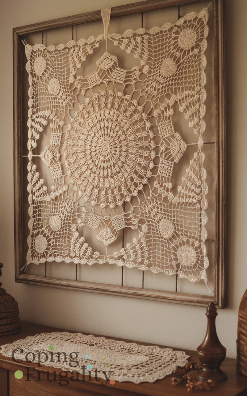 Handmade doily wall art is an elegant part of vintage crafts on a budget and you can use old doilies from family collections or inexpensive markets and you can place them inside simple frames or glue them on canvas for a delicate look and this craft brings a soft romantic style to your home and it requires very little money and effort and every piece feels unique and full of character and this idea supports your vintage crafts on a budget in a beautiful way.