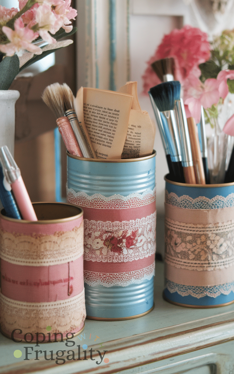 Repurposed tin cans make vintage crafts on a budget fun and easy and you can clean the cans and wrap them with fabric old book pages or lace and this transforms them into cute holders for pens brushes or flowers and you can paint them in soft antique colors for a more vintage style and this idea helps you reuse everyday items and save money and it also adds a nostalgic touch to your space and it blends beautifully with your vintage crafts on a budget.