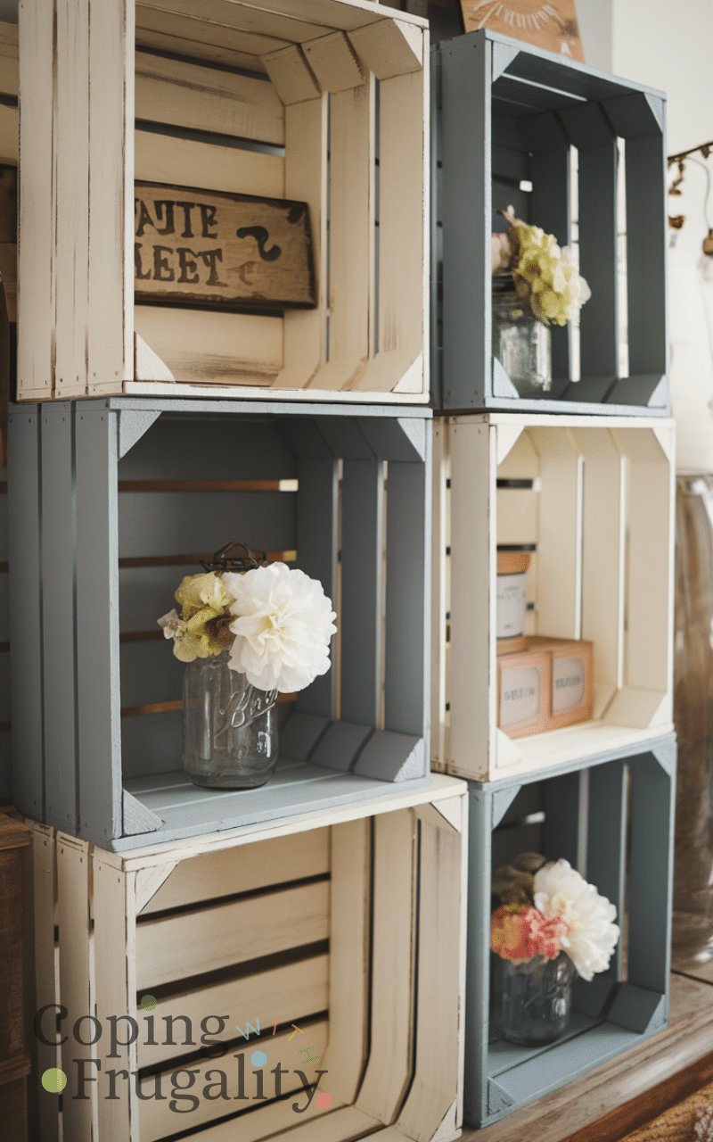 Upcycled wooden crates are a practical part of your vintage crafts on a budget and you can repaint them in off white grey or cream and add a distressed look by sanding the edges and you can use the crates for storage shelves or decor and they bring a rustic vintage feeling to your home and this idea helps you reuse old materials and avoid spending extra money and it matches perfectly with your vintage crafts on a budget.