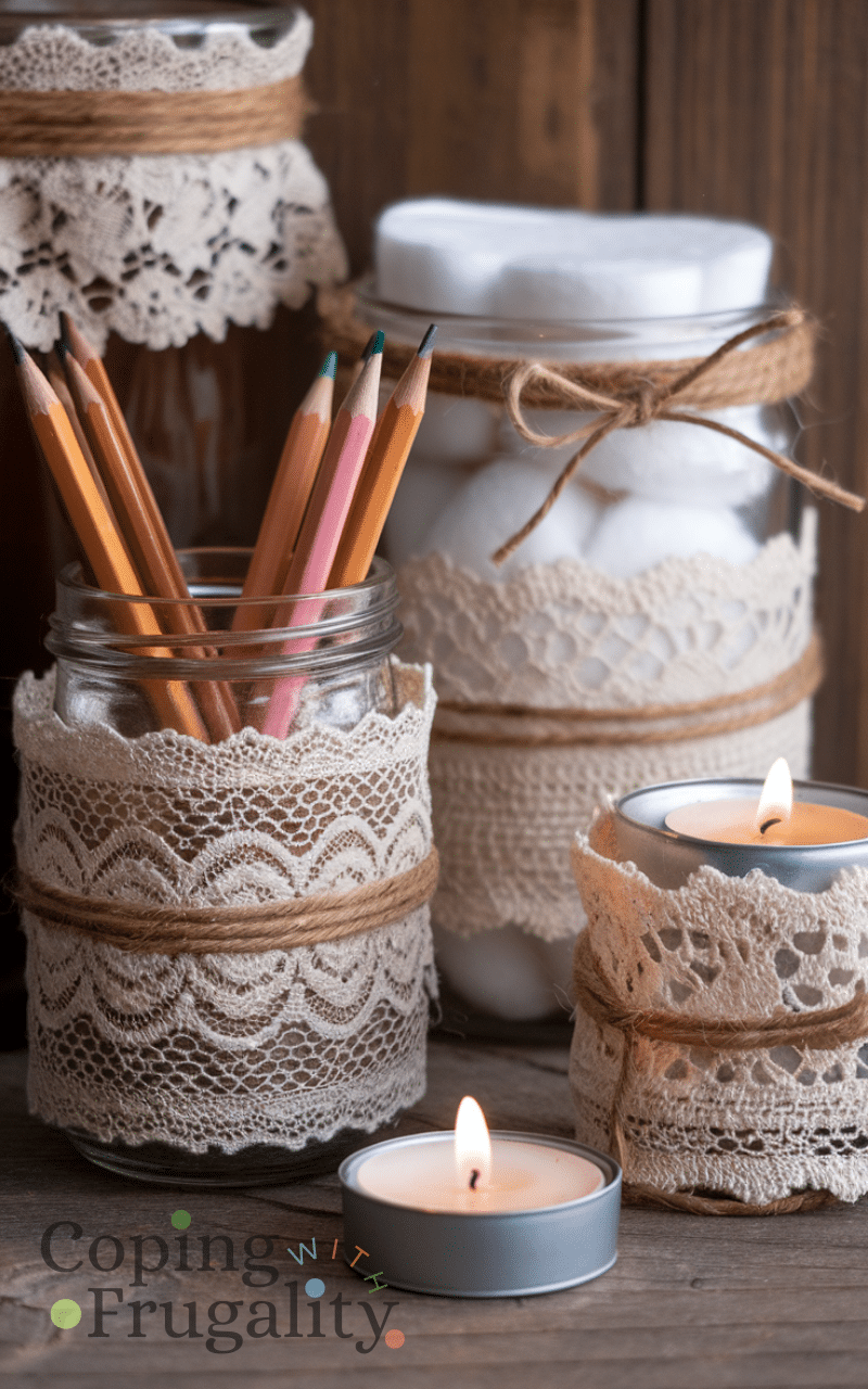 Lace wrapped jars are a simple way to decorate while staying loyal to your vintage crafts on a budget and you can wrap lace fabric around jars and secure it with twine or ribbon and this creates a delicate shabby chic look and you can use the jars for flowers pencils cotton pads or even tea lights and the craft requires very few materials and gives your home a sweet vintage atmosphere that suits your vintage crafts on a budget.