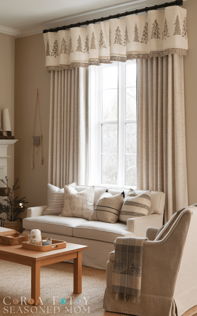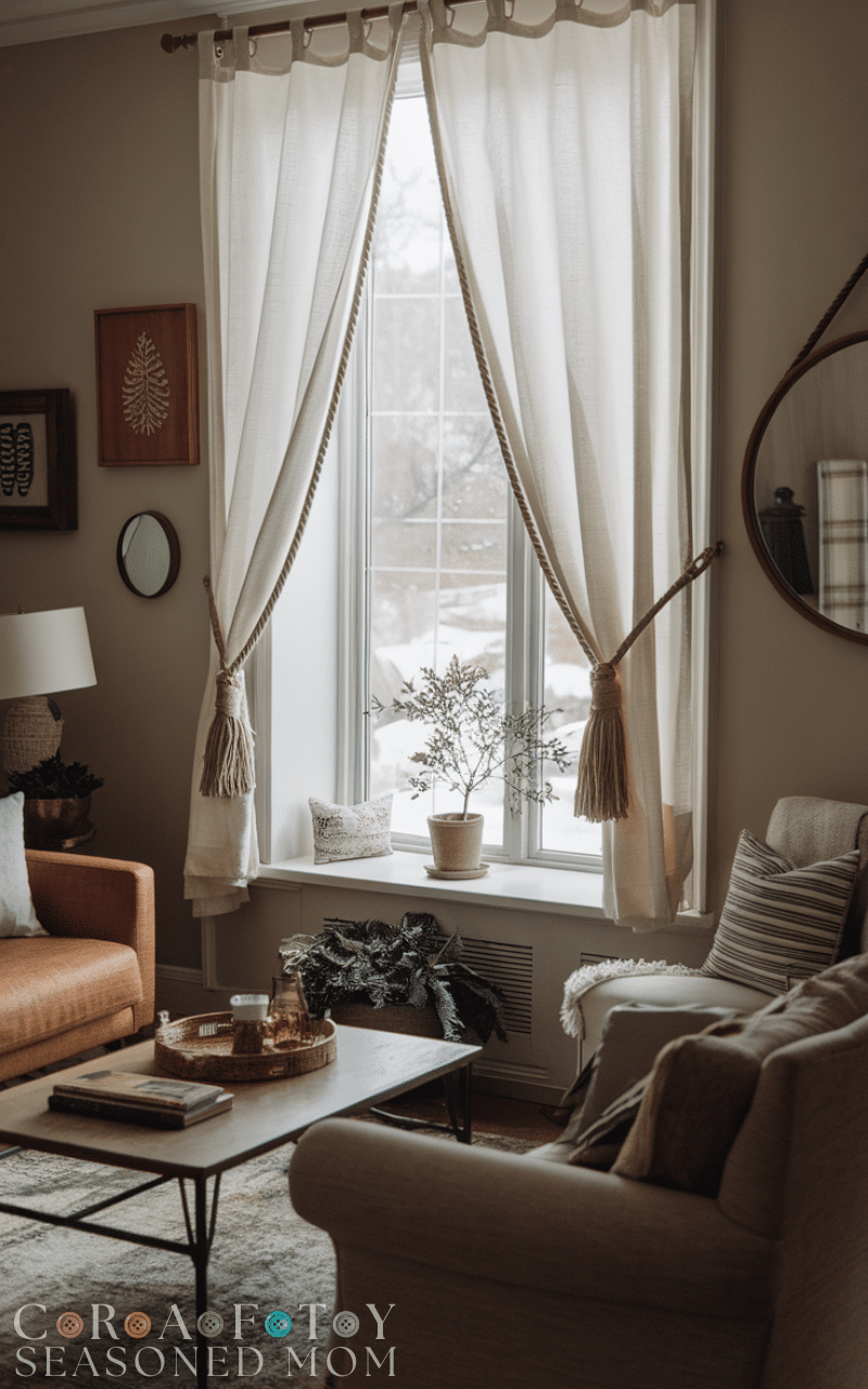 Mixing a solid curtain with patterned tiebacks or a topper adds visual interest. This winter curtain styling on a budget makes the space feel dynamic and cozy without needing expensive, fully patterned panels.