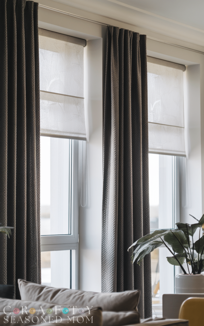 Pair curtains with inexpensive roller or Roman blinds. This combination is practical and stylish for winter curtain styling on a budget, giving additional insulation while keeping the design sleek and functional.