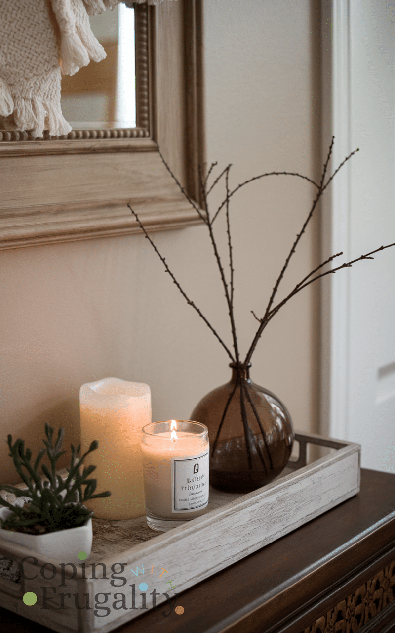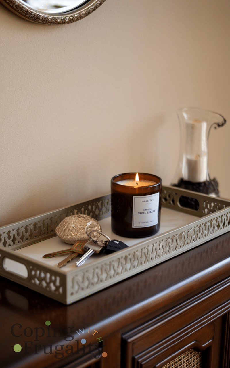 An entryway tray is the finishing touch for the best winter entryway makeover on a budget for a cozy and stylish home. Use it to hold keys, candles, or a small decorative object. This keeps essentials organized while adding a polished look.