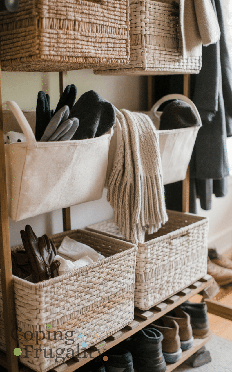 Baskets are budget-friendly heroes in the best winter entryway makeover on a budget for a cozy and stylish home. Use them to store gloves, scarves, or hats while keeping everything tidy. Neutral baskets blend easily into any décor style.