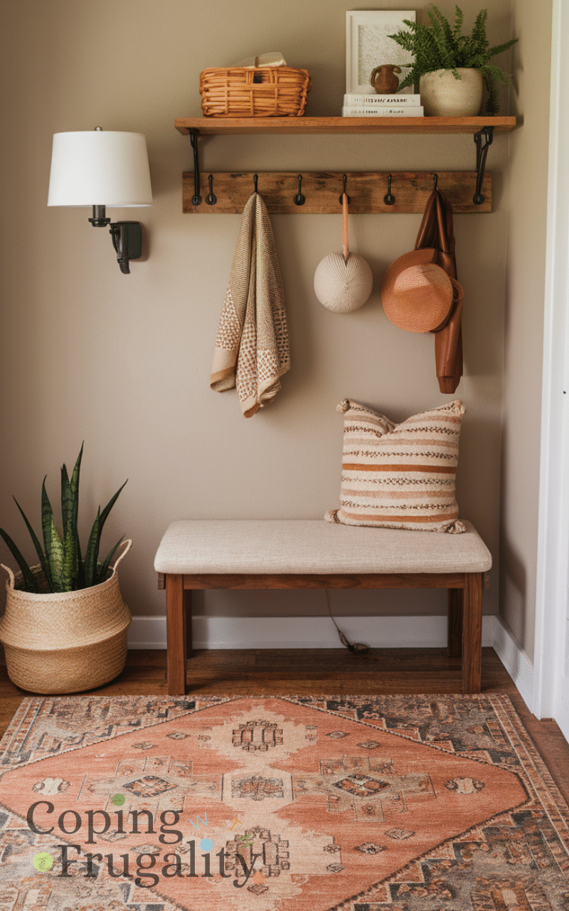 A cozy rug is the foundation of the best winter entryway makeover on a budget for a cozy and stylish home. Choose a durable rug with warm tones or subtle patterns to instantly make the space feel inviting. Rugs also protect floors from winter moisture while adding texture and comfort right at the entrance.