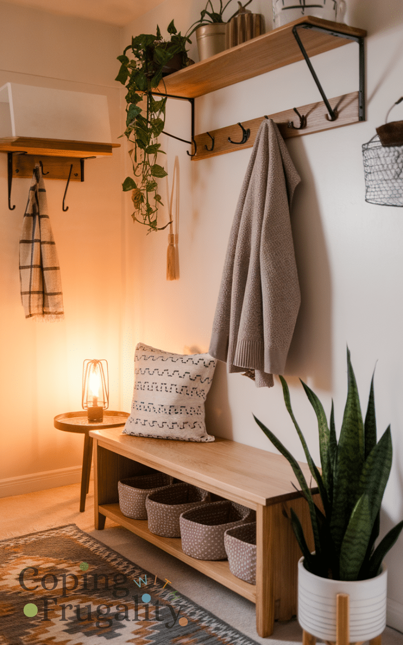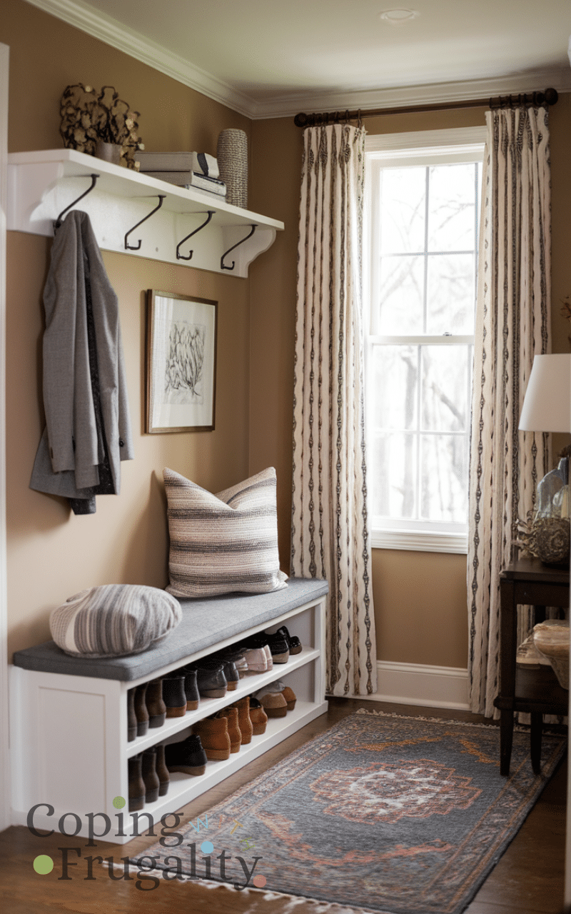 Shoe organization is essential for the best winter entryway makeover on a budget for a cozy and stylish home. A slim shoe rack or hidden storage bench keeps boots organized and prevents clutter. This makes the entryway more functional during winter.
