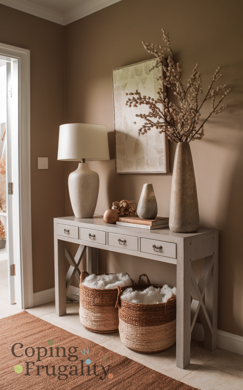 Natural elements bring warmth to the best winter entryway makeover on a budget for a cozy and stylish home. Think dried branches, pinecones, or simple greenery. These small touches add a seasonal feel without spending much.