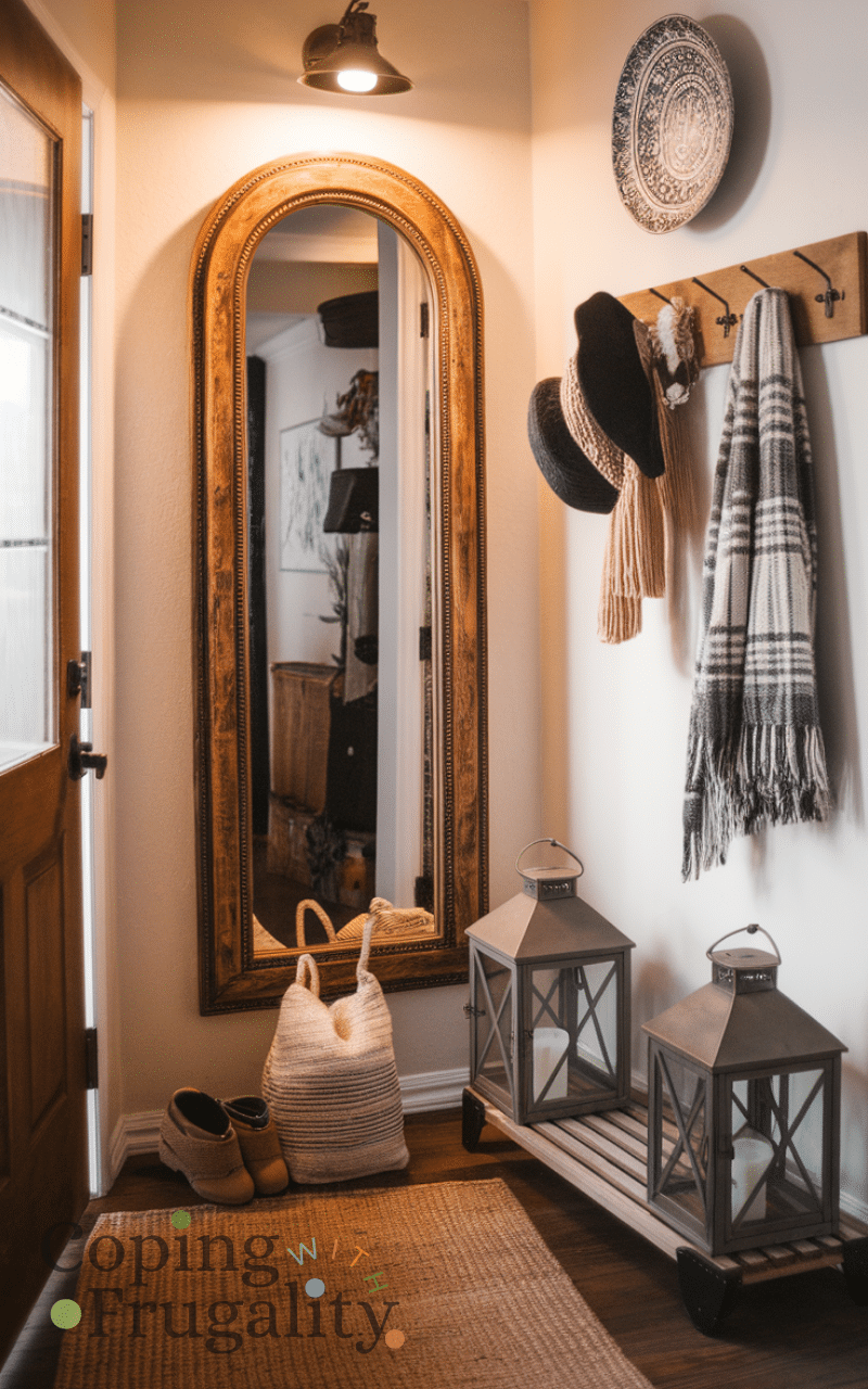 Mirrors are functional and decorative for the best winter entryway makeover on a budget for a cozy and stylish home. They reflect light and make small entryways feel bigger. A simple framed mirror also adds style while being practical for last-minute checks.